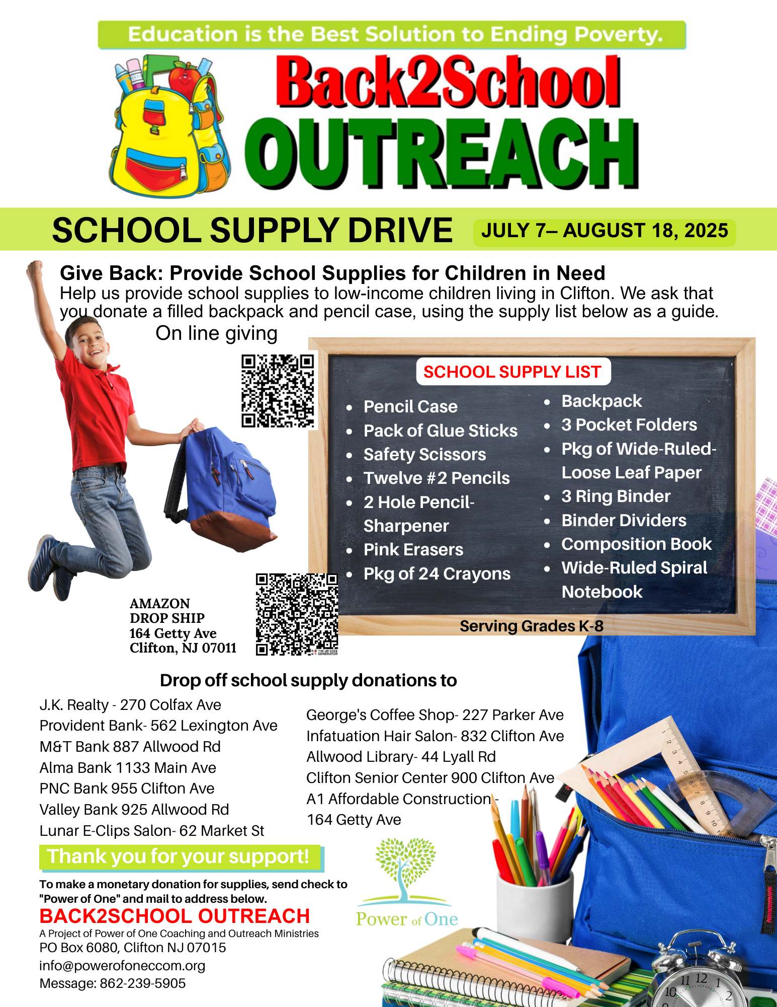 The Back2School Outreach is a program of Power Of One with the mission to provide low-income children with a free quality backpack filled with school supplies for her/his new school year. We work closely with principals and teachers and community service workers and have become a bridge between the teacher and student by providing the student the supplies they need to succeed during the year. The Back2School Outreach aims to alleviate the financial burden on families and ensure that all students have the tools they need to succeed.