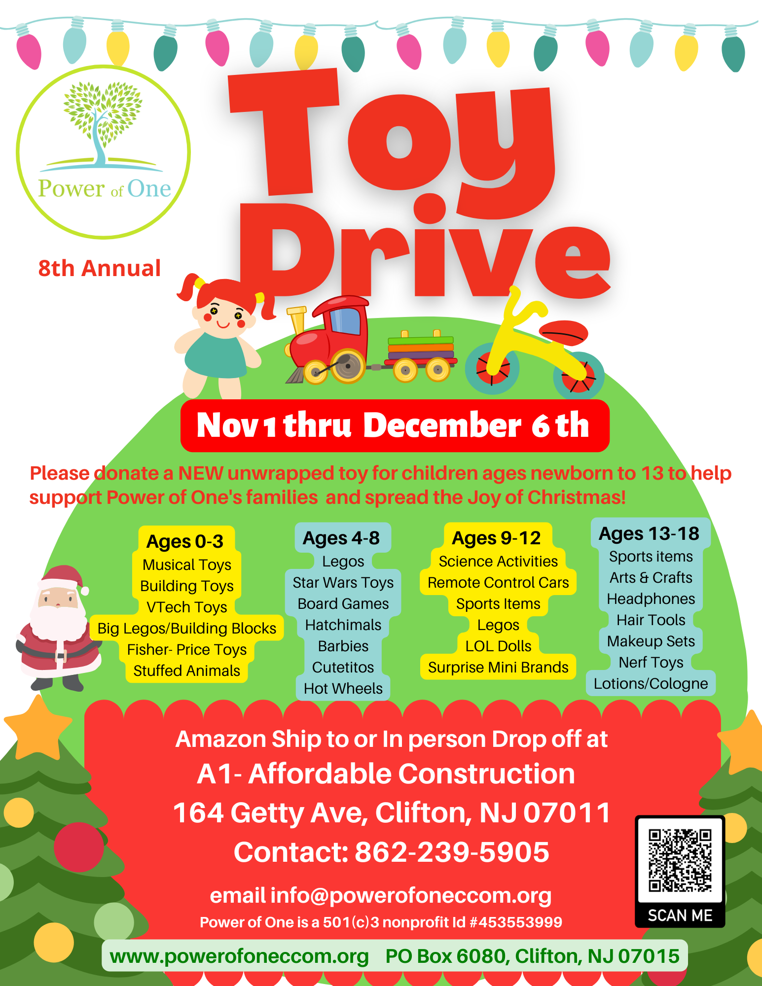 The holidays can be extremely challenging for the children we serve. Limited resources and other stressful situations make it difficult for our children and their families to celebrate. Power Of One with the generous support from local business’ has hosted an annual Holiday Party to serve over 200 children in Clifton and brighten their holidays. By inviation only!
